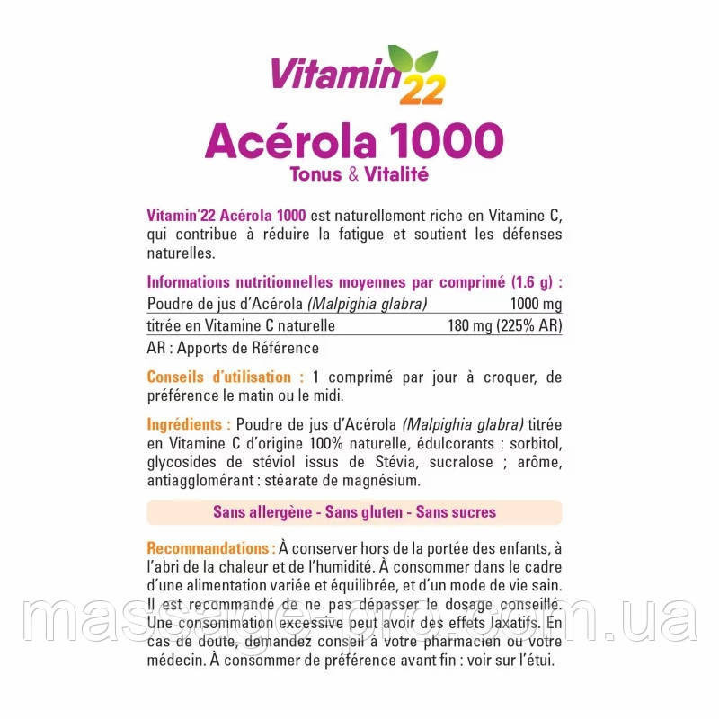 - 100% натуральний вітамін С: З ацероли, яка містить у 20-30 разів більше вітаміну С, ніж апельсини.